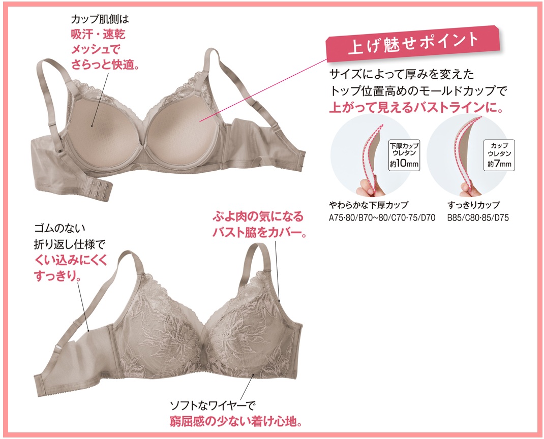何といっても上がって見えるバストラインの美しさ。年齢を重ねるとバストが下がって見えたり、上胸に張りや丸みが出づらくなったりしますが、このブラジャーはトップ位置が高めのモールドカップを使うことでバストが下がって見えることを防ぎ、カップの厚さをサイズによって変えることで余計なボリュームは出さずにふっくらとした上胸のシルエットを作ることができます。