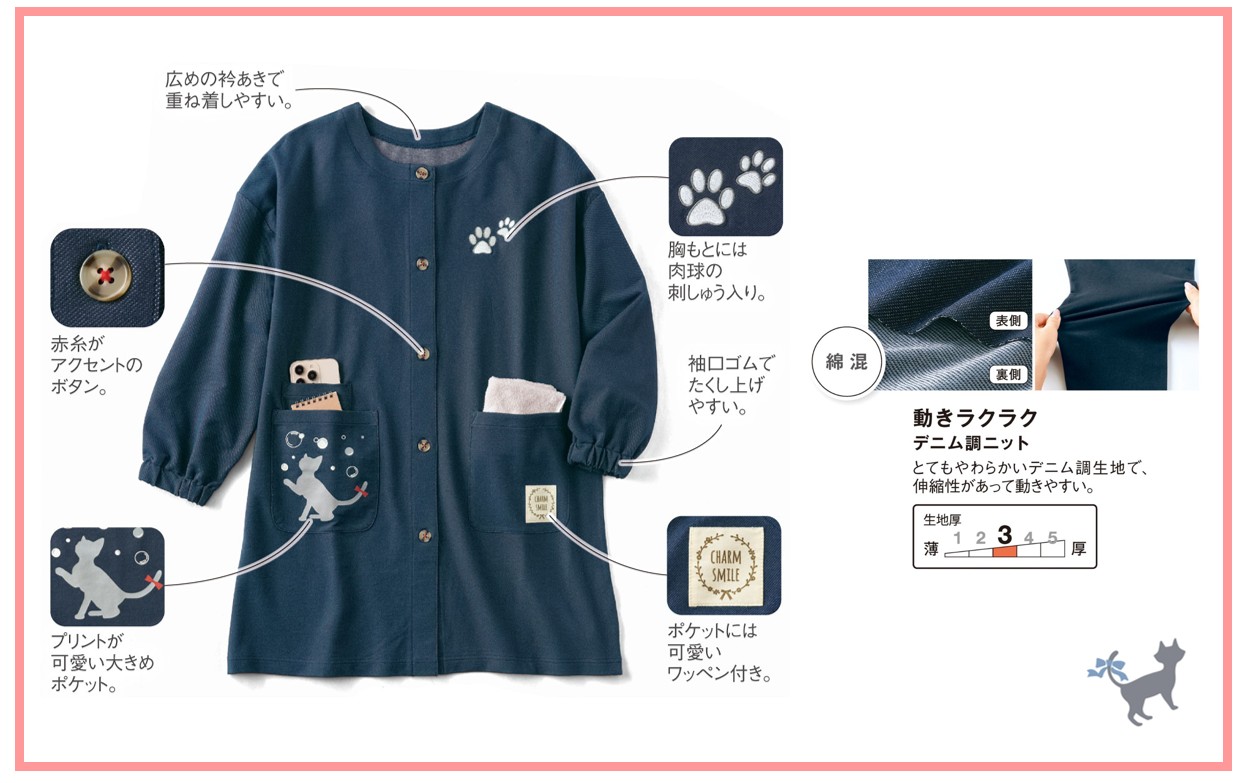 シンプルなデザインで機能性にもこだわった割烹着です。かわいらしい ねこのシルエットプリントや肉球の刺繍をあしらい、家事の時間も楽しく過ごせるデザインに仕上げました。さらに、使い勝手にもこだわり、便利な3つのポケット付き・袖口はゴム仕様で作業がしやすく、重ね着しやすいゆとりのあるサイズ感で、毎日の家事を快適にサポートします。