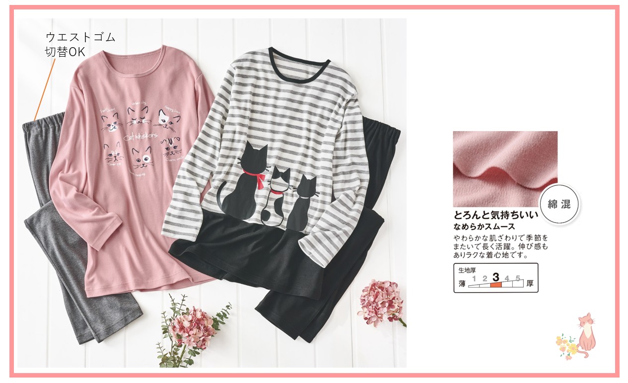 なめらかな肌触りが特徴のスムース素材を使用したパジャマに、愛らしいねこ柄のプリントをあしらいました。ねこが見せるさまざまな表情や姿がポイントです。かわいらしさだけではなく着心地にもこだわり、とろんとしたやさしい綿混の肌触りと程よい伸び感で、リラックスできる快適な着用感を目指しました。季節をまたいで長く活躍する商品です。