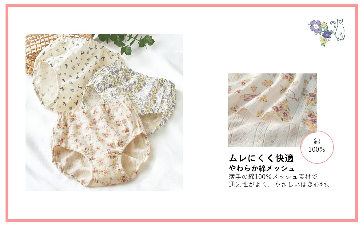 ねこ好きの方も、そうではない方も、2月22日(にゃんにゃにゃん)の「ねこの日」に合わせて、癒されるねこ柄と、人気ショーツのゆったり肌に優しい履き心地で、心地よくときめいていただきたいと思います。