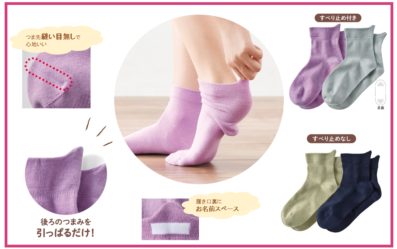 心地よい綿混素材で履き口はゆったり締め付けにくく、さらにつま先の縫い目を無くしてゴロ付きにくい仕様にもこだわりました。また、滑り止めについては、有り・無しが必要に応じて選べるように両方ご用意しました。