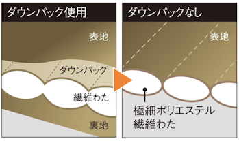 一般的なダウンコートの場合、羽毛の飛び出しを防ぐため、通常「ダウンパック」を使用しますが、「ふわ軽あったかファイバーダウンコート」は蓄熱保温中わた「ETHERMALOFT®。」を採用。暖かさをキープしつつ、ダウンパックを使わない構造にしたことで軽量化と保温性の両立を実現させました。