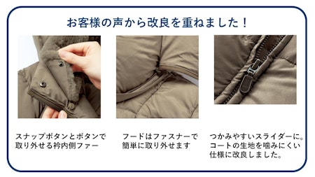 2020年の販売当初から、お客様からいただいたお声をもとに、改良を重ねてきました。暖かさと軽さに加えて、毎日着たくなる「心地よさ」を求めて実施した3つの改良をご紹介します。